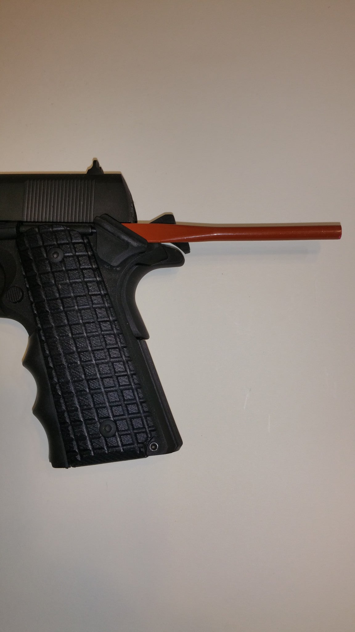 This tool designed and used by Teddy Jacobson of Actions By T is made of very high quality aluminum and coated with a vinyl layer to protect your 1911 frame while installing your thumb safety. The coating prevents scratches to your frame.